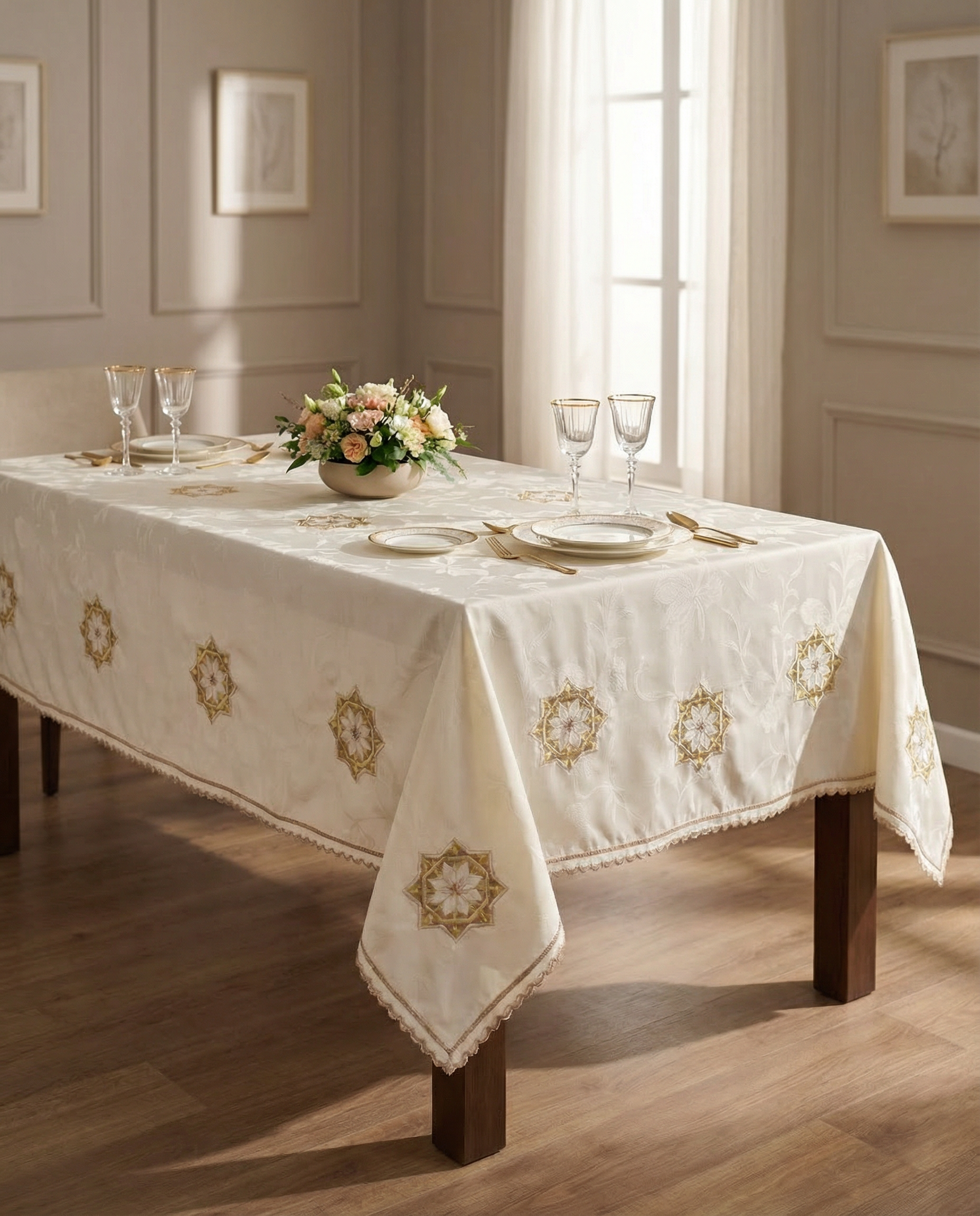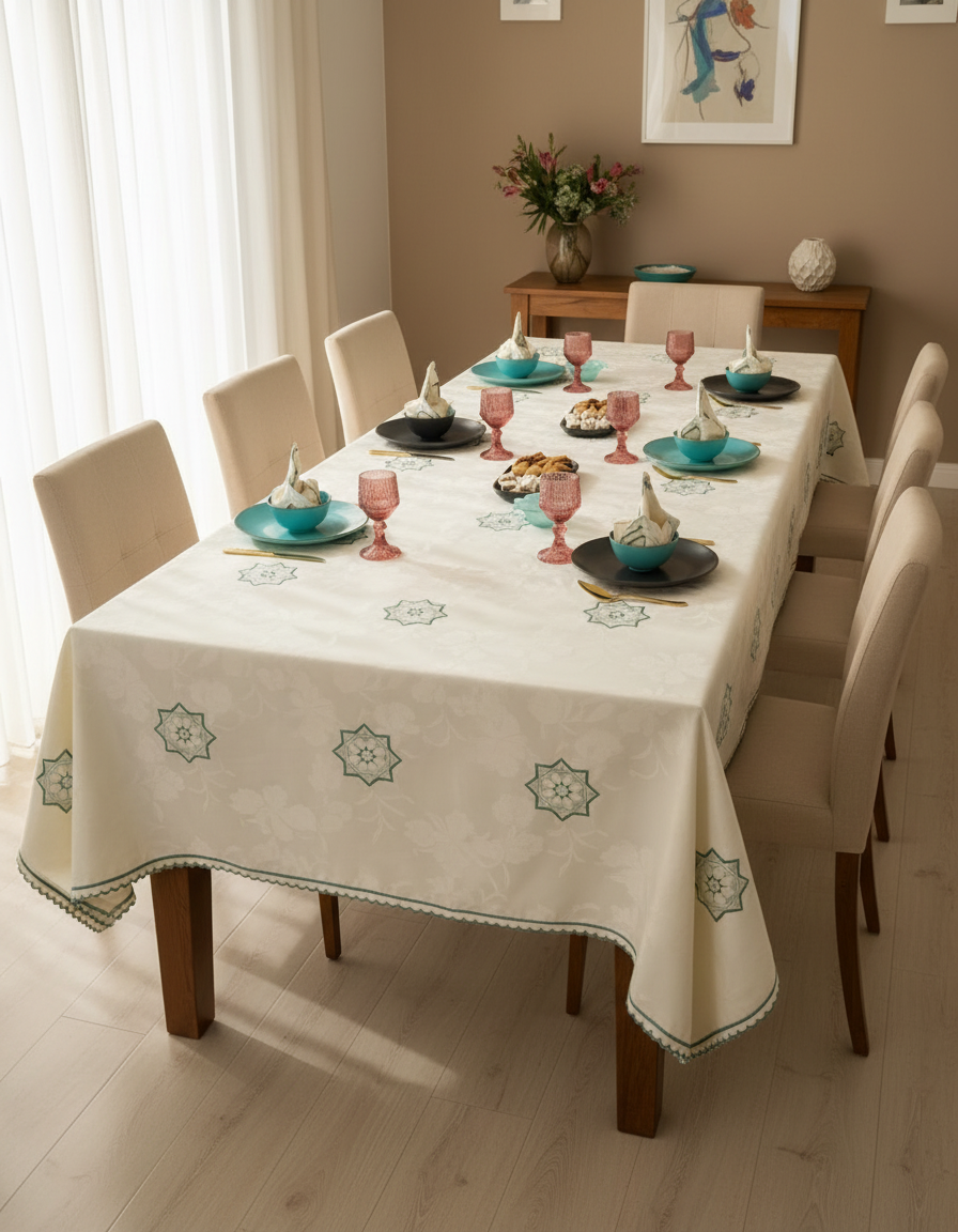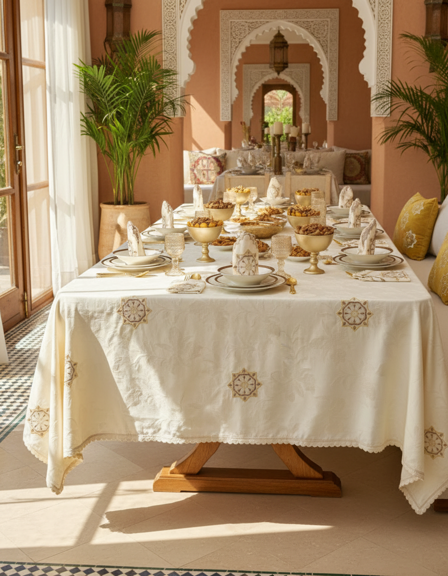 Tissée dans un tissu en jim beige traditionnel (300 fils), cette nappe incarne l’art de recevoir à la marocaine avec une noblesse discrète.